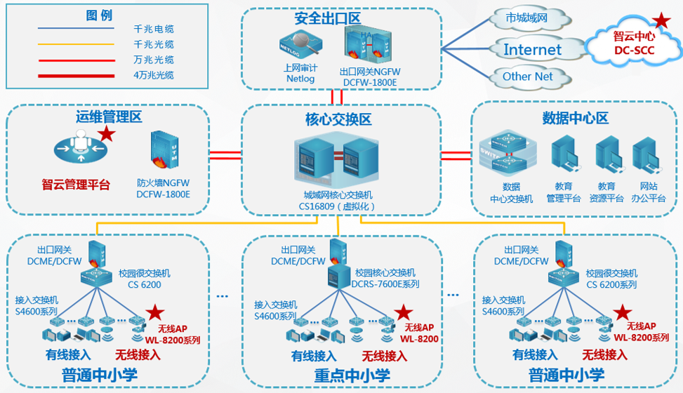 九州酷游ku游 根据普教用户无线网络管理和使用现状,以及对业务应用系统分析,遵从“云网融合 易网无忧”的新主张,对原有有线城域网采用了“云 ‧ 平台”二级智云部署架构,搭建了简单易用的综合智云管理平台,部署了无线网络。既实现了“人 ‧ 网络”的深度管理融合,也为云业务的召开打下良好的基础!总拓扑结构图如下: